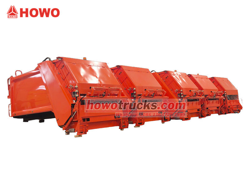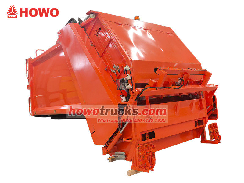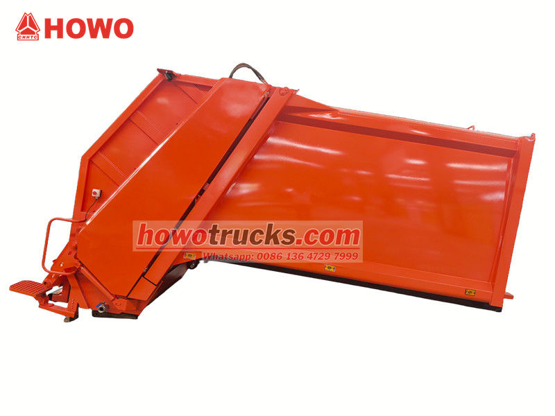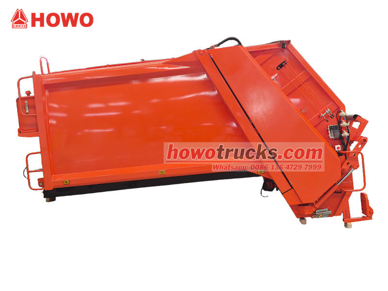 Cấu trúc thượng tầng của xe chở rác Howo 10 CBM kiểu nạp phía sau là phần cốt lõi của xe, chủ yếu bao gồm thùng chứa rác, bộ phận nạp, cơ cấu đẩy, hệ thống thủy lực và hệ thống điều khiển điện tử. Nguyên lý hoạt động của nó là nén rác vào thùng chứa bằng tấm đẩy thủy lực, giúp giảm đáng kể thể tích và nâng cao hiệu quả vận chuyển. Cấu trúc thượng tầng được làm bằng thép cường độ cao, đảm bảo độ kín tuyệt vời, ngăn ngừa rò rỉ và hạn chế sự lan tỏa mùi hôi.