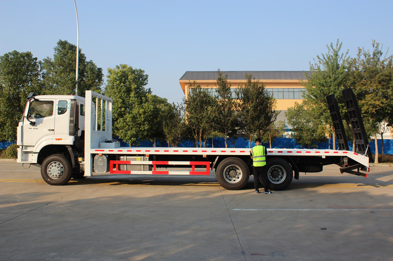 Xe tải tự bốc xếp, còn được gọi là xe vận chuyển sàn phẳng, xe tải tự xếp dỡ, xe vận chuyển máy xúc, là loại xe tải chuyên dụng được thiết kế để vận chuyển các loại máy móc xây dựng hạng nặng không thể tháo rời, chẳng hạn như máy xúc và máy bốc xếp. Các tính năng chính của nó bao gồm sàn phẳng có thể mở rộng bằng thủy lực và các thiết bị tự bốc xếp như chân chống thủy lực, tời và cầu dẫn. Nhờ khung gầm chịu tải cao và cấu trúc sàn chống trượt, được gia cố, nó cho phép vận chuyển an toàn và hiệu quả cũng như tự bốc dỡ các thiết bị lớn tại các công trường xây dựng, mỏ và trung tâm logistics, giảm sự phụ thuộc vào máy móc nâng hạ bên ngoài. Lấy xe tải tự bốc xếp sàn phẳng 25 tấn SINOTRUK HOWO làm ví dụ, chiếc xe này tăng cường khả năng vận chuyển hạng nặng chuyên nghiệp với động cơ Weichai 380 mã lực và trục dẫn động chịu tải nặng. Sàn phẳng của nó có thể được mở rộng bằng thủy lực đến 3 mét chiều rộng, và nó được trang bị chân chống thủy lực phía trước 25 tấn và tời 8 tấn, mang lại độ tin cậy, khả năng chịu tải và hiệu quả tự bốc xếp vượt trội ngay cả trong điều kiện làm việc khó khăn.