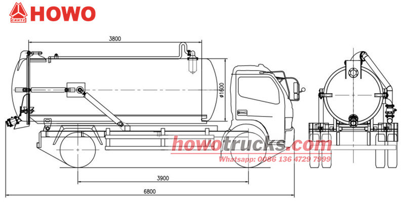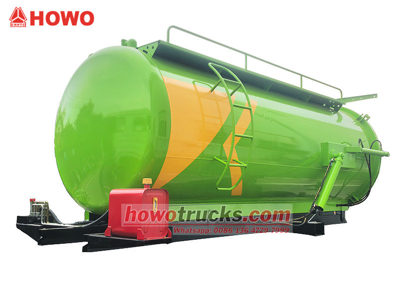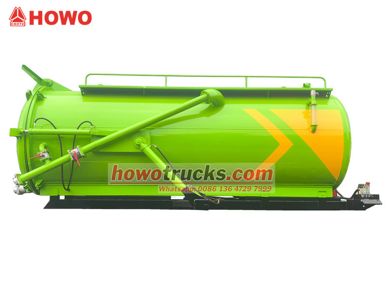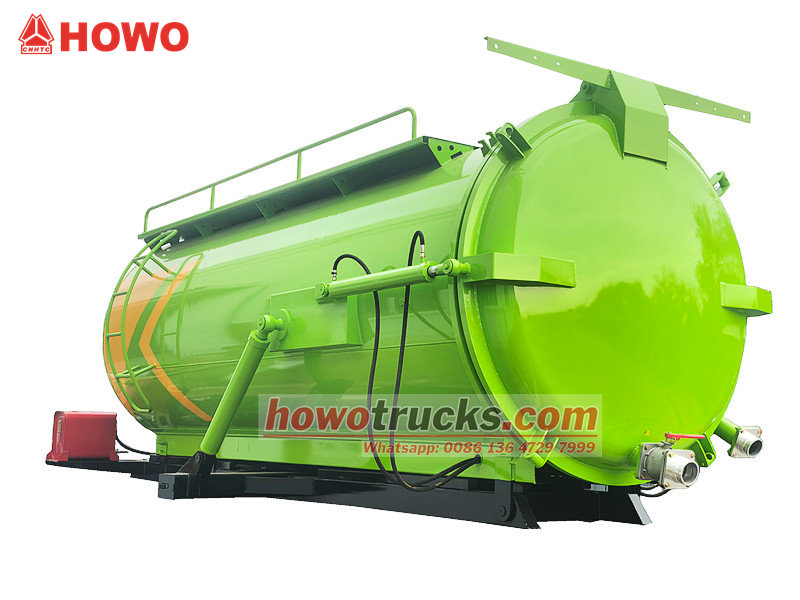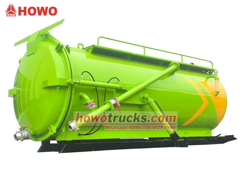 Thân xe bồn hút hầm cầu Howo 8m³ (còn được gọi là bộ xe bơm hút chân không 8m³, thân trên xe bồn hút chân không 8.000 lít, bộ xe hút nước thải chân không 8m³, bộ thân trên xe bồn xử lý nước thải, kết cấu thượng tầng xe bồn hút chân không 8m³, bộ xe bồn bơm hút bùn, bộ thân trên xe hút chân không, v.v.) Thiết bị này được dùng để gắn lên khung gầm nhằm làm sạch và thu gom chất lỏng như nước thải. Nó thích hợp để làm sạch cống rãnh, hố ga, bể phốt, mương rãnh, v.v.