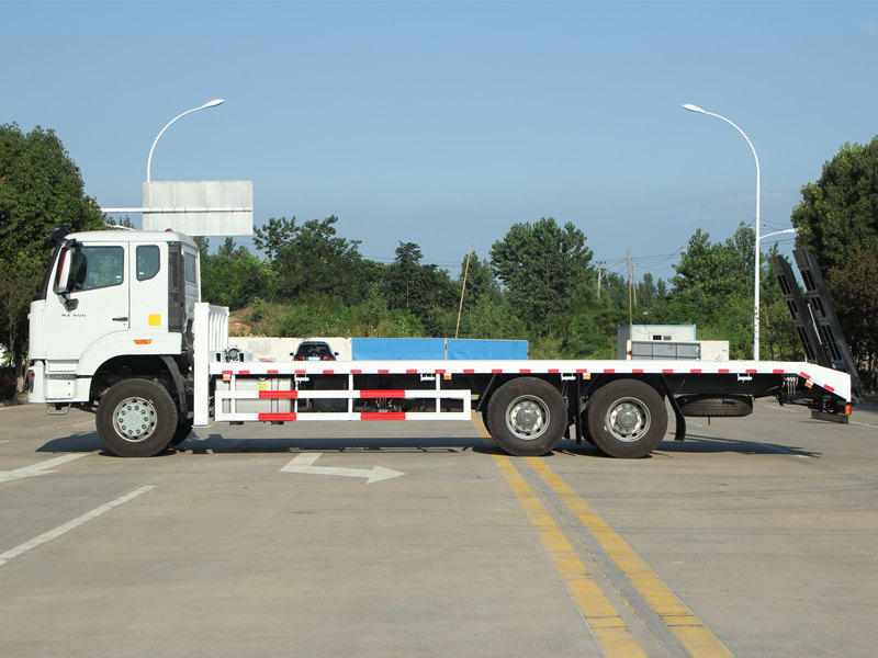 Cái này Xe tải tự bốc dỡ HOWO NX Được trang bị các tính năng chuyên nghiệp và mạnh mẽ. Thùng xe được làm bằng thép tấm chống trượt dày 8 mm, kích thước 8600×2500 mm, được thiết kế đặc biệt để vận chuyển an toàn các máy xúc cỡ trung và các thiết bị khác. Phía sau xe được trang bị hai cầu dẫn thủy lực dài 2 mét để dễ dàng bốc dỡ máy móc. Ngoài ra, hai chân chống thủy lực phía trước, mỗi chân chống có khả năng nâng 20 tấn, giúp tăng cường đáng kể độ ổn định khi hoạt động trên địa hình không bằng phẳng. Một tời thủy lực 4 tấn cũng được lắp đặt ở phía trước, có thể sử dụng cho các nhiệm vụ cứu hộ hoặc cố định thiết bị, đáp ứng toàn diện nhu cầu về tính đa năng và độ tin cậy của người dùng Philippines.