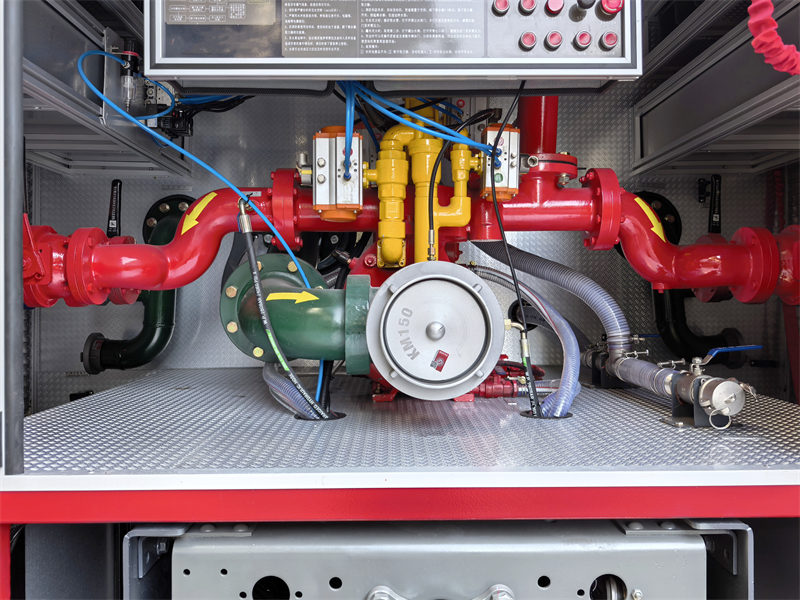 Hệ thống bể chứa: Phần phía trước là phòng thiết bị, nơi lưu trữ các thiết bị chữa cháy khác nhau (như vòi chữa cháy, bình chữa cháy, rìu chữa cháy, cờ lê, búa, cuốc, v.v.) để dễ dàng sử dụng. Ở giữa, có một bể chứa nước bằng thép carbon dung tích 6 m³ và một bể chứa bọt chữa cháy dung tích 2 m³, cả hai đều được trang bị cửa thăm ở phía trên.